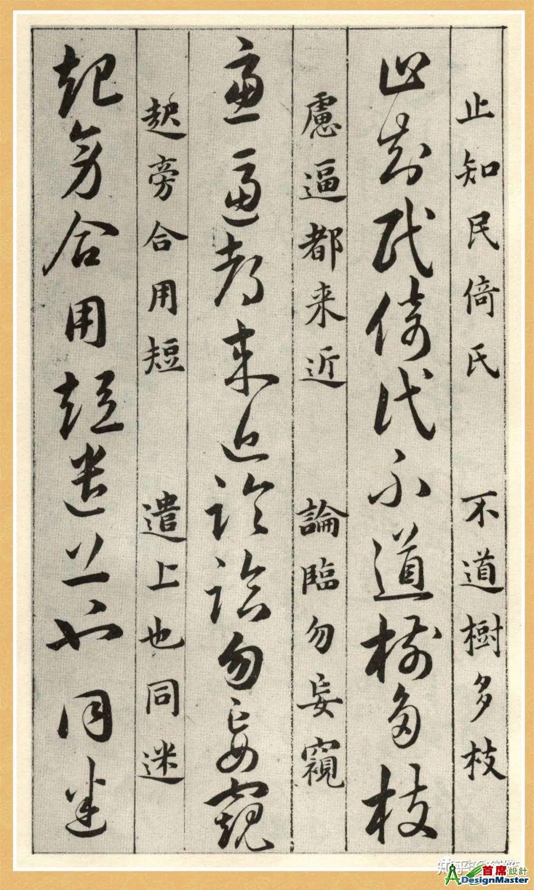 扫搊休得混:“扫”和“搊”是易混字,注意区别; 彭赴可相侵:“彭”用此写法和“赴”字也相混; 世老偏多少:“世”和“老”字的头部同用“多交叉符”写法,只脚部不同; 谢衡正浅深:要知道草书结体是浅是深,看看“谢”和“衡”这两个字吧:“谢”字是左中右结构,而“衡”字却是“行字符”结构,如“街”、“术”字等; 酒花分水草:“酒”字用“氵”旁,“花”字用“艹”头,其余部份都一样; 技放别支文:“技”和“放”字主要区别在右旁的“支”和“文”。